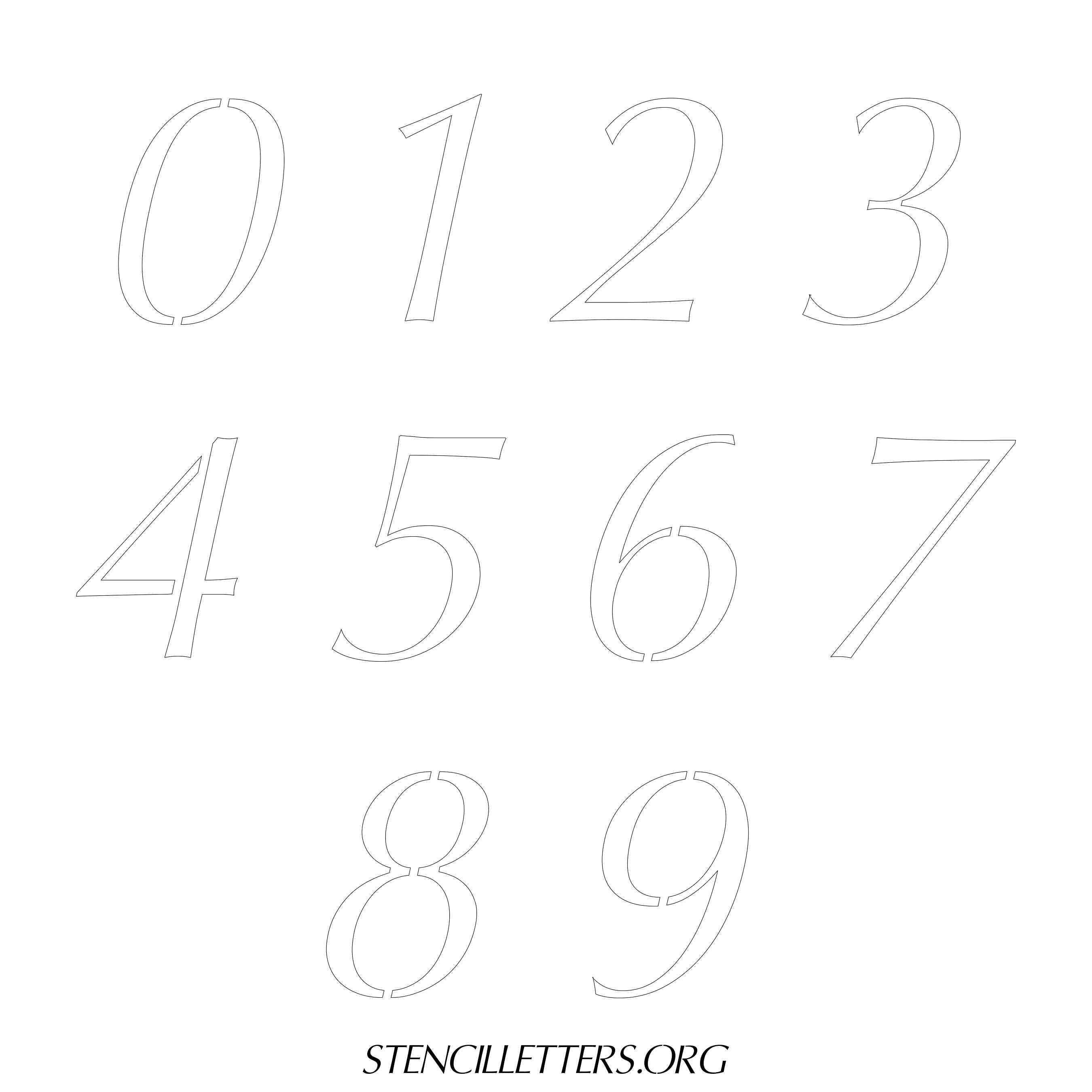 Stencil Design 38 Italic. Print these free numbers stencils and make your own DIY templates for your stenciling projects. Available in high resolution printable sizes: 4 Inch, 5 Inch, 6 Inch, 7 Inch, 8 Inch, 9 Inch and 10 Inch.