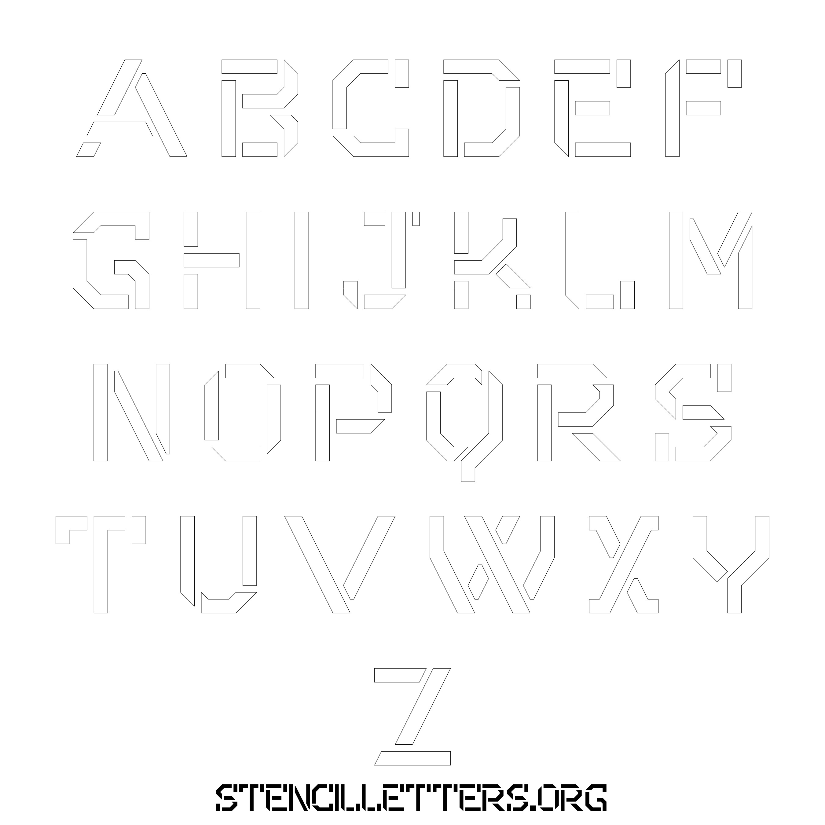Stencil Design 226 Futuristic. Print these free uppercase letter stencils and make your own DIY templates for your stenciling projects. Available in high resolution printable sizes: 4 Inch, 5 Inch, 6 Inch, 7 Inch, 8 Inch, 9 Inch and 10 Inch.
